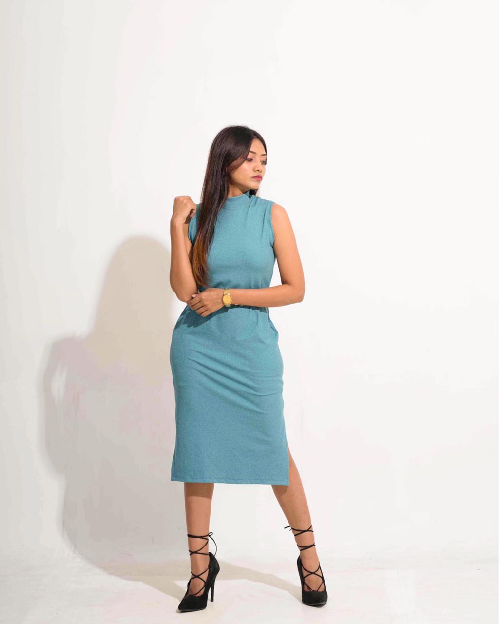 Dusty Teal Mock Neck Slit Dress TA085-S